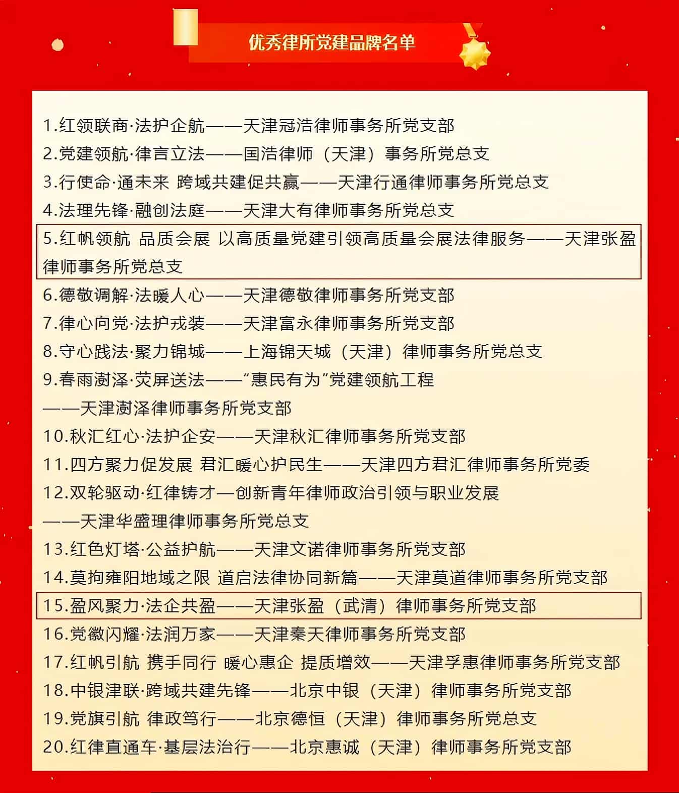 张盈律师事务所总部及武清分所同时被评为天津市优秀律所党建品牌
